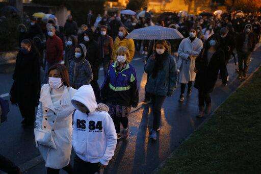 People attend a memorial march in homage to the history teacher who was beheaded last week, Tuesday, Oct.20, 2020 in Conflans-Sainte-Honorine, northwest of Paris. Samuel Paty was beheaded on Friday by an 18-year-old Moscow-born Chechen refugee, who was later shot dead by police. Police officials said Paty had discussed caricatures of Islam's Prophet Muhammad with his class, leading to threats. (AP Photo/Lewis Joly)