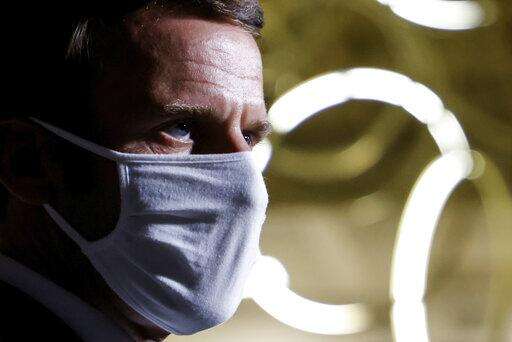French President Emmanuel Macron delivers a speech at the end of a visit on the fight against separatism at the Seine Saint Denis prefecture headquarters in Bobigny, a northeastern suburbs of Paris, Tuesday Oct. 20, 2020. Authorities were looking into about 50 associations suspected of encouraging hate speech and the issue will be discussed at a Cabinet meeting Wednesday after the history teacher Samuel Paty was beheaded on Friday by an 18-year-old Moscow-born Chechen refugee. (Ludovic Marin, Pool via AP)
