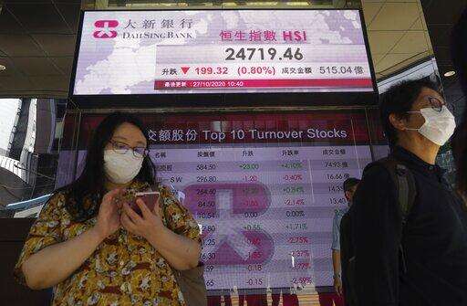 The gloom carried into trading in Asia, where Japan's Nikkei 225 lost 0.3% to 23,428.70 and the Hang Seng in Hong Kong slipped 0.8% to 24,719.38. South Korea's Kospi gained a fraction of a point to 2,344.48, while the S&P/ASX 200 slumped 1.8% to 6,042.60. The Shanghai Composite index gave up 0.2% to 3,244.23.