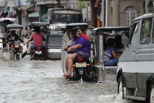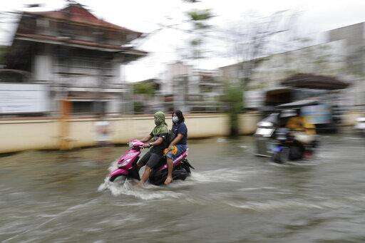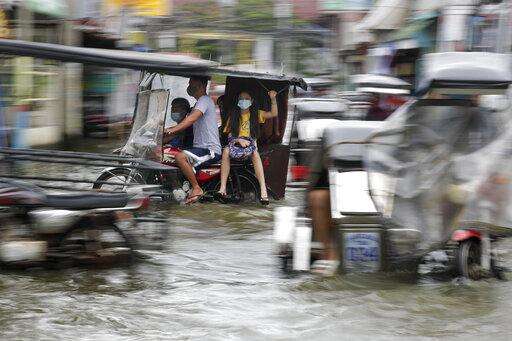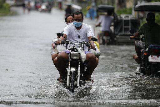 A woman wearing a mask to prevent the spread of the coronavirus rides a motorcycle as they pass a flooded street due to Typhoon Molave in Pampanga province, northern Philippines on Monday, Oct. 26, 2020. A fast moving typhoon has forced thousands of villagers to flee to safety in provinces. (AP Photo/Aaron Favila) The Associated Press