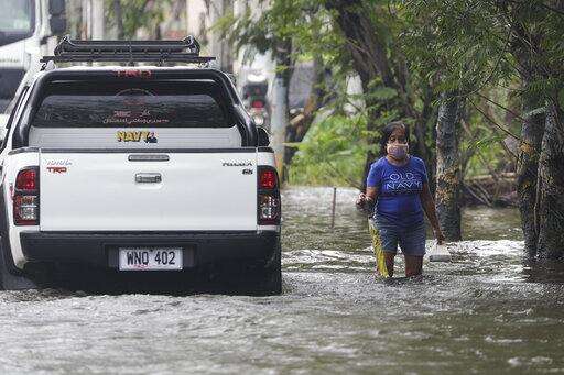 A resident negotiates a flooded road due to Typhoon Molave in Pampanga province, northern Philippines on Monday, Oct. 26, 2020. A fast moving typhoon has forced thousands of villagers to flee to safety in provinces. (AP Photo/Aaron Favila) The Associated Press