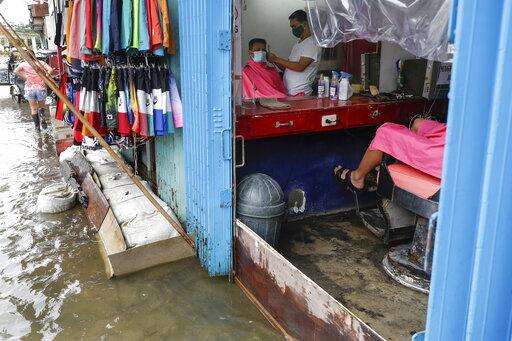 A man has his hair cut at a barbershop flooded by Typhoon Molave in Pampanga province, northern Philippines on Monday, Oct. 26, 2020. The fast moving typhoon has forced thousands of villagers to flee to safety in provinces. (AP Photo/Aaron Favila) The Associated Press