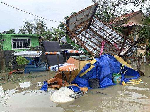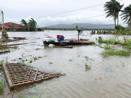 The remains of a house is surrounded by floods in Pola town on the island of Mindoro, central Philippines, Monday, Oct. 26, 2020. A fast-moving typhoon forced thousands of villagers to flee to safety in provinces south of the Philippine capital Monday, flooding rural villages and ripping off roofs, officials said. (AP Photo/Erik De Castro) The Associated Press