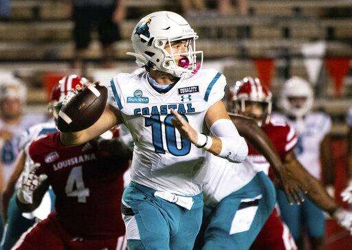 Coastal Carolina quarterback Grayson McCall (10) looks to pass during the first half of an NCAA football game against Louisiana-Lafayette in Lafayette, La., Wednesday, Oct. 14, 2020. (AP Photo/Paul Kieu) The Associated Press