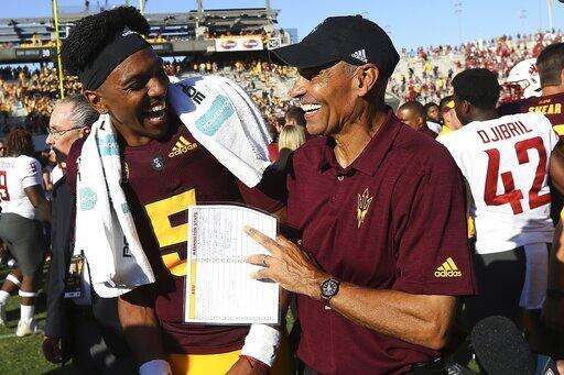 FILE - This Saturday, Oct. 12, 2019, file photo shows Arizona State quarterback Jayden Daniels (5) celebrating with head coach Herm Edwards after an NCAA college football game win over Washington State, in Tempe, Ariz. Arizona State won seven games and played in a bowl game in 2018, exceeding outside expectations in its first season under Edwards, the former NFL player, coach and commentator. The Sun Devils took another step last season, winning eight games and the Sun Bowl. (AP Photo/Ross D. Franklin, File) The Associated Press