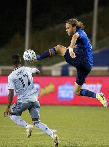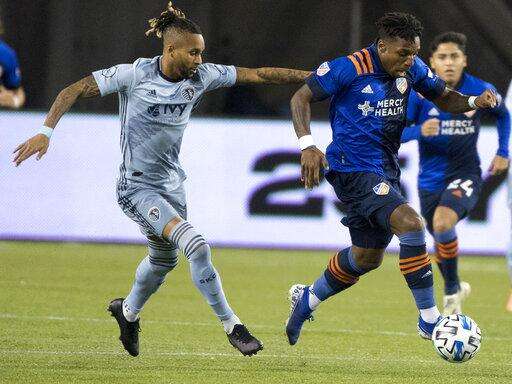 FC Cincinnati midfielder Joseph-Claude Gyau (36) works against Sporting Kansas City defender Amadou Dia (13) in the box during the first half of an MLS soccer match Wednesday, Oct. 28, 2020, in Cincinnati. (Albert Cesare/The Cincinnati Enquirer via AP) The Associated Press