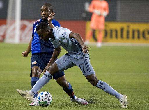 FC Cincinnati midfielder Joseph-Claude Gyau, right, takes the ball down the pitch as Sporting Kansas City defender Amadou Dia (13) defends during the first half of an MLS soccer match Wednesday, Oct. 28, 2020, in Cincinnati. (Albert Cesare/The Cincinnati Enquirer via AP) The Associated Press