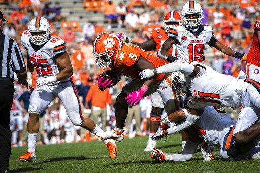 Clemson running back Travis Etienne, already a two-time ACC player of the year, is 43 yards shy of setting a new career rushing record in the ACC, breaking Ted Brown of North Carolina State's record of 4,602 yards set from 1975-78. Etienne already holds league records for rushing touchdowns (64) and total touchdowns (71). ... North Carolina has two of the top four running backs in the conference with Michael Carter averaging 116.8 yards and Javonte Williams averaging 112.4 yards. They are the only teammates to have played more than one game who are both averaging better than 100 rushing yards.
