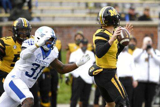 Missouri quarterback Connor Bazelak, right, throws under pressure from Kentucky linebacker Jamar Watson (31) during the first half of an NCAA college football game Saturday, Oct. 24, 2020, in Columbia, Mo. (AP Photo/L.G. Patterson) The Associated Press