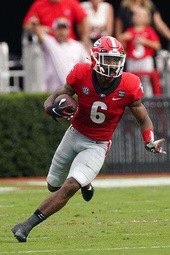 Georgia running back Kenny McIntosh (6) looks for running room in the first half of an NCAA college football game against Tennessee Saturday, Oct. 10, 2020, in Athens, Ga. (AP Photo/John Bazemore) The Associated Press