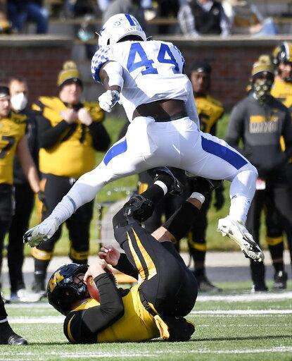 Kentucky linebacker Jamin Davis (44) leaps over Missouri quarterback Connor Bazelak, bottom, during the first half an NCAA college football game Saturday, Oct. 24, 2020, in Columbia, Mo. (AP Photo/L.G. Patterson) The Associated Press