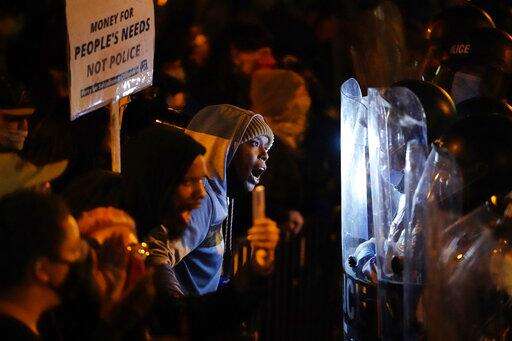 Protesters confront police during a march, Tuesday Oct. 27, 2020, in Philadelphia. Hundreds of demonstrators marched in West Philadelphia over the death of Walter Wallace, a Black man who was killed by police in Philadelphia on Monday. Police shot and killed the 27-year-old on a Philadelphia street after yelling at him to drop his knife. (AP Photo/Matt Slocum)