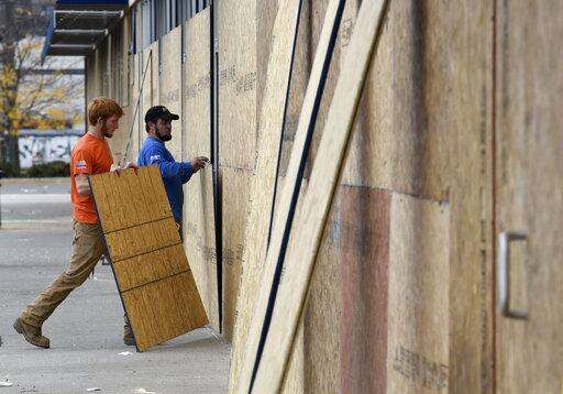 Two workers board up a store front, Wednesday, Oct. 28, 2020, in Philadelphia. Demonstrators protested the death of Walter Wallace Jr., who was fatally shot by police Monday after authorities say he ignored orders to drop a knife. Some businesses were cleaning up damage after video showed people streaming into stores and stealing goods on the opposite side of the city from where Wallace was shot. (AP Photo/Michael Perez)