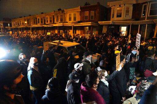 Protesters confront police during a march Tuesday Oct. 27, 2020 in Philadelphia. Hundreds of demonstrators marched in West Philadelphia over the death of Walter Wallace, a Black man who was killed by police in Philadelphia on Monday. Police shot and killed the 27-year-old on a Philadelphia street after yelling at him to drop his knife. (AP Photo/Matt Slocum)