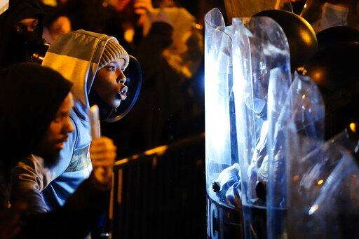 A demonstrator raises a fist near Philadelphia police in Philadelphia, late Tuesday, Oct. 27, 2020. Hundreds of demonstrators marched in West Philadelphia over the death of Walter Wallace Jr., a Black man who was killed by police in Philadelphia on Monday. Police shot and killed the 27-year-old on a Philadelphia street after yelling at him to drop his knife. (AP Photo/Matt Slocum)