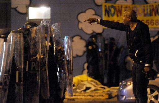 A protester points while facing police during a demonstration Tuesday night, Oct. 27, 2020, in Philadelphia. Hundreds of demonstrators marched in West Philadelphia over the death of Walter Wallace Jr., a Black man who was killed by police in Philadelphia on Monday. (AP Photo/Michael Perez)