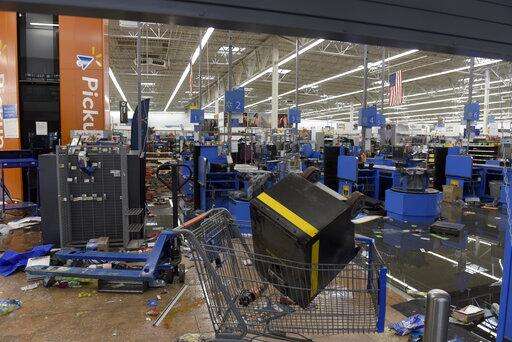 Items litter the ground Wednesday, Oct. 28, 2020, inside a Walmart in Philadelphia that was damaged in last night's protests. Demonstrators protested the death of Walter Wallace Jr., who was fatally shot by police Monday after authorities say he ignored orders to drop a knife. Some businesses were cleaning up damage after video showed people streaming into stores and stealing goods on the opposite side of the city from where Wallace was shot. (AP Photo/Michael Perez)