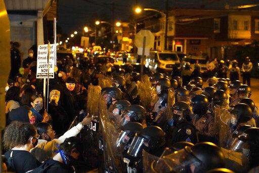 Protesters confront police during a march Tuesday, Oct. 27, 2020, in Philadelphia. Hundreds of demonstrators marched in West Philadelphia over the death of Walter Wallace, a Black man who was killed by police in Philadelphia on Monday. Police shot and killed the 27-year-old on a Philadelphia street after yelling at him to drop his knife. (AP Photo/Matt Slocum)