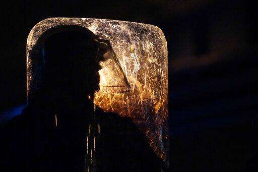 A Philadelphia police officer is silhouetted behind a shield during a demonstration in Philadelphia, Tuesday, Oct. 27, 2020. Hundreds of demonstrators marched in West Philadelphia over the death of Walter Wallace Jr., a Black man who was killed by police in Philadelphia on Monday. Police shot and killed the 27-year-old on a Philadelphia street after yelling at him to drop his knife. (AP Photo/Matt Slocum)