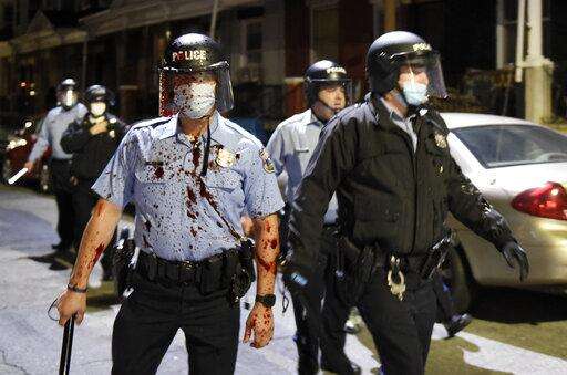 A Philadelphia police officer is covered with an unidentified red substance during a confrontation with protesters, Tuesday, Oct. 27, 2020, in Philadelphia. Hundreds of demonstrators marched in West Philadelphia over the death of Walter Wallace Jr., a Black man who was killed by police in Philadelphia on Monday. (AP Photo/Michael Perez)