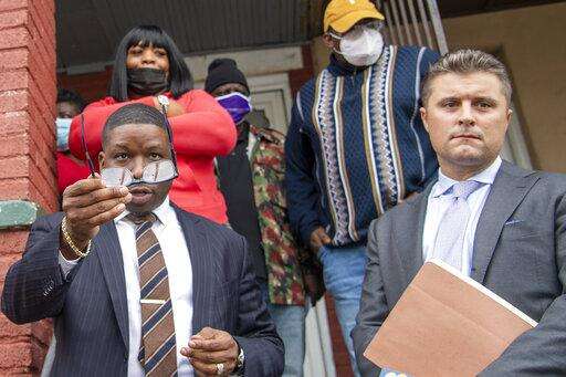 Attorney's for the Wallace family, Shaka Johnson, left, and Kevin P. O'Brien, right, speak to the media outside Walter Wallace Jr.'s home in Philadelphia, Pa., Tuesday, Oct. 27, 2020. Police officers fatally shot Wallace, a 27-year-old Black man armed with a knife during a confrontation the day before, an incident that quickly raised tensions in the neighborhood and sparked a standoff that lasted deep into the night. (Jose F. Moreno/The Philadelphia Inquirer via AP)