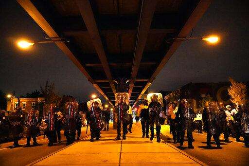 Philadelphia police officers form a line during a demonstration in Philadelphia, late Tuesday, Oct. 27, 2020. Hundreds of demonstrators marched in West Philadelphia over the death of Walter Wallace Jr., a Black man who was killed by police in Philadelphia on Monday. Police shot and killed the 27-year-old on a Philadelphia street after yelling at him to drop his knife. (AP Photo/Matt Slocum)