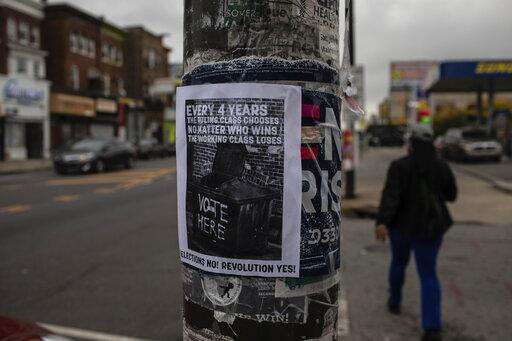 A line on a flyer posted on a lamppost in Philadelphia's west reads "Elections no! Revolution yes!" on Wednesday, Oct. 28, 2020. Protests have erupted in the neighborhood following the police shooting death of Walter Wallace, Jr. (AP Photo/Robert Bumsted) The Associated Press