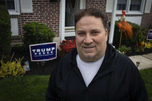 Scott Brady stands in front of his house with a Trump campaign sign in Springfield, Pa. on Wednesday, Oct. 28, 2020. Once a Democrat, Brady says he switched parties to vote for Donald Trump in 2016, and plans to vote for him again in 2020. (AP Photo/Robert Bumsted) The Associated Press