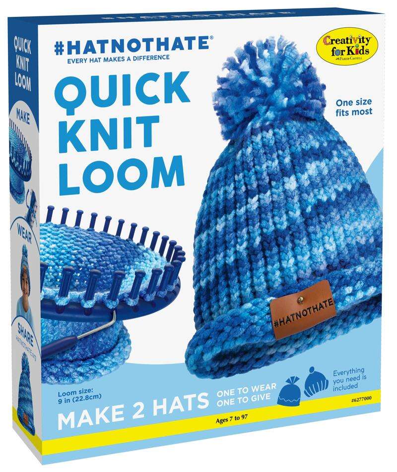 Creativity for Kids partnered with the anti-bullying campaign #HATNOTHATE to produce this blue-hat-making kit - the color blue representing solidarity and support of bullying prevention. Yarn for two hats is included, and the loom can be used repeatedly.