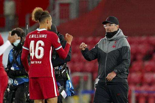 Liverpool's Rhys Williams bumps fists with Liverpool's manager Jurgen Klopp after the Champions League Group D soccer match between Liverpool and FC Midtjylland at Anfield stadium, in Liverpool, England, Tuesday, Oct. 27, 2020. (Jon Super/Pool via AP) The Associated Press