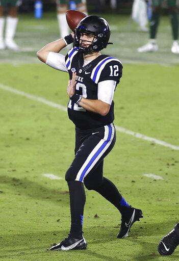 Duke quarterback Gunnar Holmberg (12) throws a pass against Charlotte during the first half of an NCAA college football game Saturday, Oct. 31, 2020, in Durham, N.C. (Jaylynn Nash/Pool Photo via AP) The Associated Press