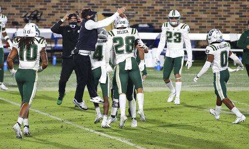 Charlotte coach Will Healy celebrates a turnover with his players during the first half against Duke in an NCAA college football game Saturday, Oct. 31, 2020, in Durham, N.C. (Jaylynn Nash/Pool Photo via AP) The Associated Press