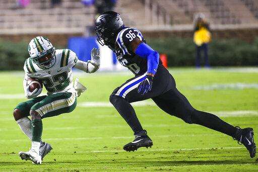 Charlotte wide receiver Micaleous Elder (23) runs with the ball while Duke defensive end Chris Rumph II (96) chases him during an NCAA college football game Saturday, Oct. 31, 2020, in Durham, N.C. (Jaylynn Nash/Pool Photo via AP) The Associated Press