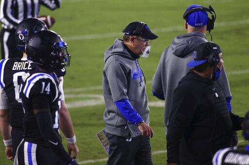 Duke coach David Cutcliffe stands along the sideline during the first half against Charlotte in an NCAA college football game Saturday, Oct. 31, 2020, in Durham, N.C. (Jaylynn Nash/Pool Photo via AP) The Associated Press