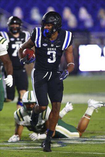 Duke wide receiver Jontavis Robertson (1) runs with the ball during the first quarter against Charlotte in an NCAA college football game Saturday, Oct. 31, 2020, in Durham, N.C. (Jaylynn Nash/Pool Photo via AP) The Associated Press