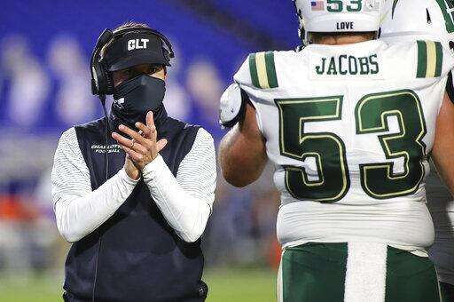 Charlotte coach Will Healy applauds during the first quarter of the team's NCAA college football game against Duke on Saturday, Oct. 31, 2020, in Durham, N.C. (Jaylynn Nash/Pool Photo via AP) The Associated Press