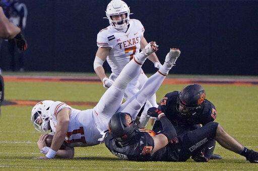 Texas linebacker Joseph Ossai sealed the victory by sacking Oklahoma State quarterback Spencer Sanders on fourth down in overtime. Ossai finished with 12 tackles, six tackles for loss, three sacks and a forced fumble.