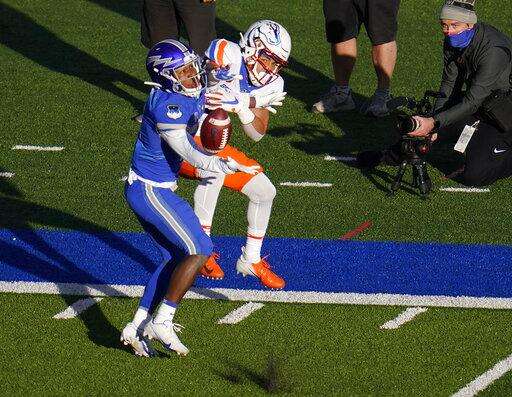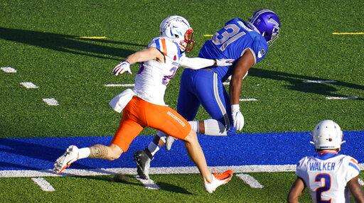 Air Force cornerback Elisha Palm, left, blocks a pass intended for Boise State wide receiver Khalil Shakir during the first half of an NCAA college football game Saturday Oct. 31, 2020, at Air Force Academy, Colo. (AP Photo/David Zalubowski) The Associated Press