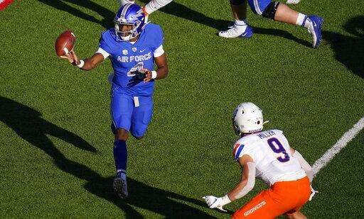 Air Force quarterback Haaziq Daniels, left, pitches the ball as Boise State linebacker Brock Miller defends during the first half of an NCAA college football game Saturday Oct. 31, 2020, at Air Force Academy, Colo. (AP Photo/David Zalubowski) The Associated Press