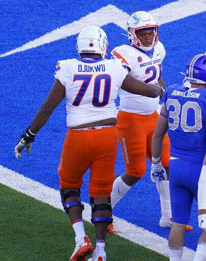 Boise State running back Andrew Van Buren, rear, is congratulated by offensive lineman John Ojukwu after a touchdown during the first half of the team's NCAA college football game against Air Force on Saturday Oct. 31, 2020, at Air Force Academy, Colo. (AP Photo/David Zalubowski) The Associated Press