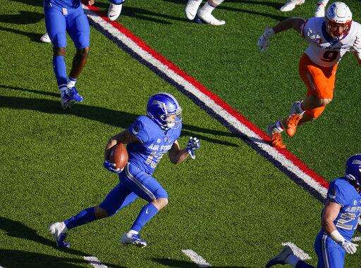 Air Force wide receiver Brandon Lewis carries the ball as Boise State linebacker Brock Miller pursues during the first half of an NCAA college football game Saturday Oct. 31, 2020, at Air Force Academy, Colo. (AP Photo/David Zalubowski) The Associated Press