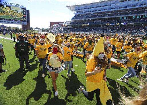 The Baylor Line students run onto the field before Baylor's NCAA college football game against TCU in Waco, Texas, Saturday, Oct. 31, 2020. (Jerry Larson/Waco Tribune-Herald via AP) The Associated Press