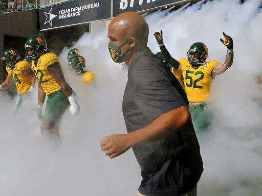Baylor coach Dave Aranda takes the field with his team before an NCAA college football game against TCU in Waco, Texas, Saturday, Oct. 31, 2020. (Jerry Larson/Waco Tribune-Herald via AP) The Associated Press