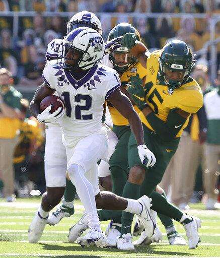 TCU wide receiver Derius Davis (12) runs past the Baylor special teams for a touchdown in the first half of an NCAA college football game in Waco, Texas, Saturday, Oct. 31, 2020. (Jerry Larson/Waco Tribune-Herald via AP) The Associated Press