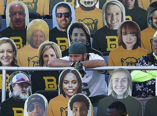 A fan watches an NCAA college football game between TCU and Baylor while seated next to cutouts in Waco, Texas, Saturday, Oct. 31, 2020. (Jerry Larson/Waco Tribune-Herald via AP) The Associated Press