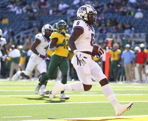 TCU running back Zach Evans (6) scores a touchdown against Baylor duirng the first half of an NCAA college football game in Waco, Texas, Saturday, Oct. 31, 2020. (Jerry Larson/Waco Tribune-Herald via AP) The Associated Press