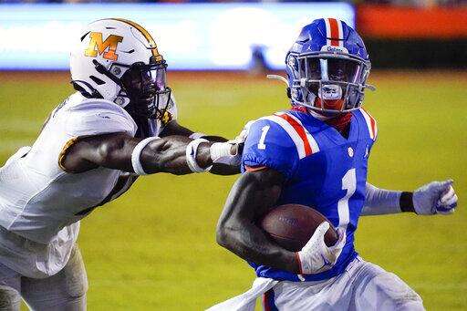 GAINESVILLE, Fla. (AP) - Kadarius Toney scored three times, Kyle Trask became the first player in school history with four touchdown passes in four consecutive games and No. 10 Florida returned from a three-week layoff to handle Missouri 41-17 on Saturday night in the Swamp.