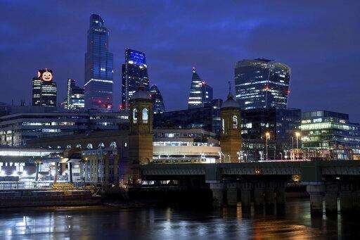 A pumpkin is illuminated on Tower 42 to celebrate Halloween, in the City of London, early Saturday Oct. 31, 2020. Other buildings include, 20 Fenchurch Street known as The Walkie-Talkie shown back right, The Shard at back centre. (John Walton/PA via AP) The Associated Press