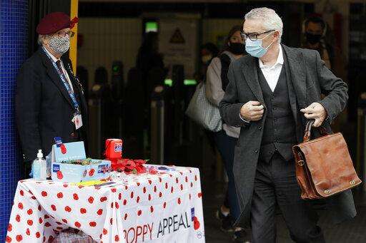 L Frank Plugge wears a mask and gloves as he sells poppies to raise money for the Royal British Legion annual poppy appeal in London, Thursday, Oct. 29, 2020. Around 100,000 people are catching the coronavirus every day in England, according to the latest Imperial College London study. (AP Photo/Kirsty Wigglesworth) The Associated Press