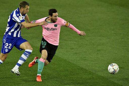 Barcelona's Lionel Messi, right, vies for the ball with Alaves' Florian Lejeune during the Spanish La Liga soccer match between Alaves and Barcelona at Mendizorroza stadium in Vitoria, Spain, Saturday, Oct. 31, 2020. (AP Photo/Alvaro Barrientos) The Associated Press